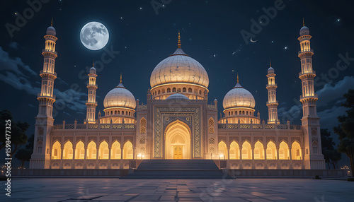 Illuminated mosque with domes and minarets under a full moon at night with starry sky above