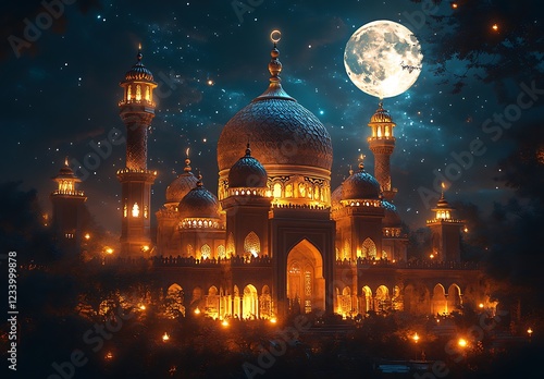 Illuminated Mosque with Domes Under a Full Moon in a Starry Night Sky
