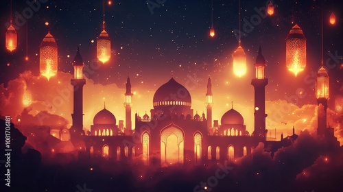 Illuminated Mosque with Lanterns and Stars Against a Night Sky
