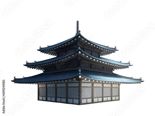 Illuminated multi-tiered pagoda roof with intricate patterns against black temple architecture