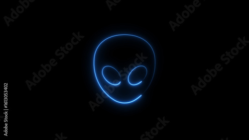 Illuminated neon alien head illustration on a black backdrop representing outer space and extraterrestrial life