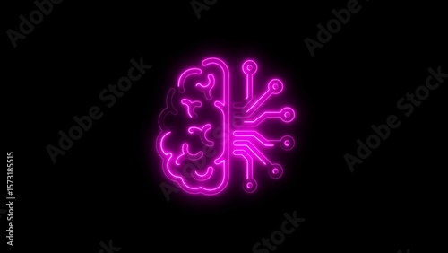 Illuminated neon brain and circuit board symbol represents artificial intelligence and technology