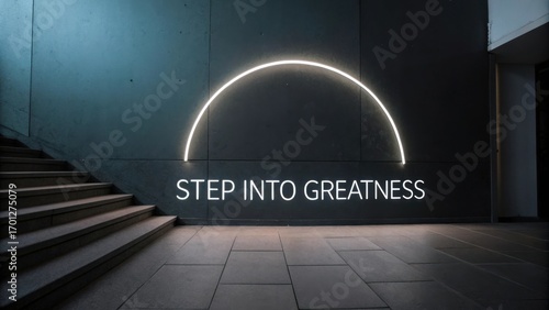 Illuminated neon sign inviting personal growth in modern urban setting with stairs leading to success and ambition fulfillment