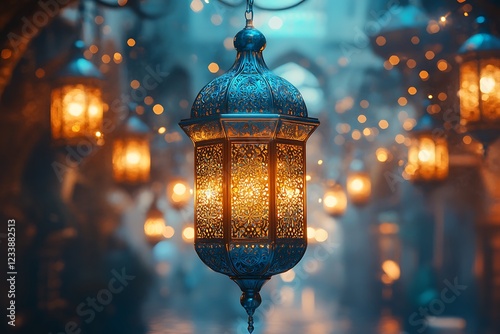 Illuminated Ornate Lantern Hanging Against a Blurred Background of Lanterns