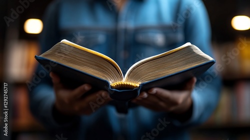Illuminated Pages: A Person Reading a Book in a Library