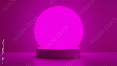 Illuminated pink sphere on a circular pedestal against a gradient background