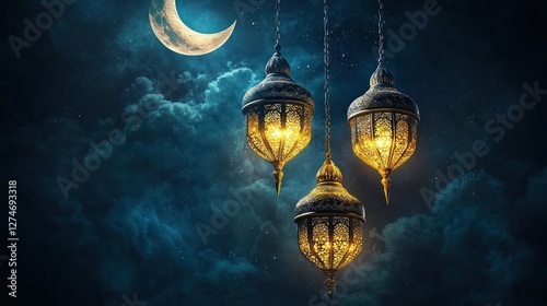 Illuminated Ramadan lanterns hanging at night, crescent moon and clouds