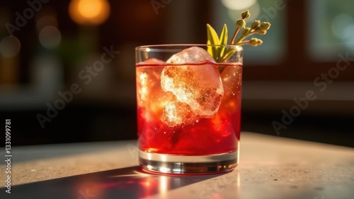 Illuminated Refreshment A Sparkling Red Beverage in a Rocks Glass with Ice and Garnish