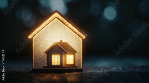 Illuminated safe containing miniature home model enigmatic atmosphere digital nighttime close-up security concept