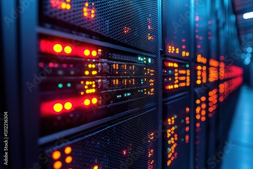 Illuminated Server Rack Data Center Technology, Network Infrastructure, Close-up
