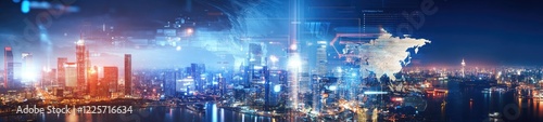 Illuminated Skyscrapers with Superimposed World Map and Digital Data