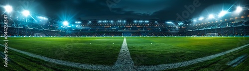 Illuminated soccer stadium at night, view from the corner, green pitch, ready for a match 8K , high-resolution, ultra HD,up32K HD