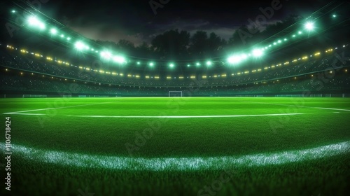 illuminated soccer stadium at night with empty stands and green field floodlights