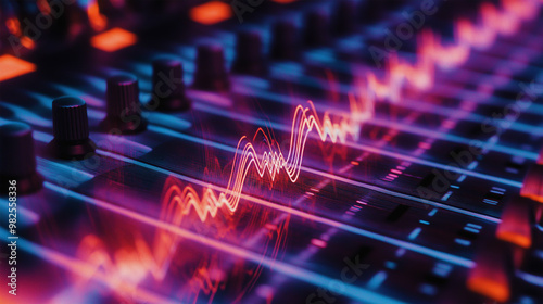 Illuminated Soundwaves Dancing Across a Mixer Board, Capturing the Fiery Essence of Music Through Vivid Hues of Red and Blue on a Dark Background in a Technological Symphony