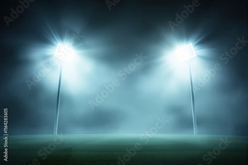 Illuminated stadium lights on a foggy night with a green grass field below.