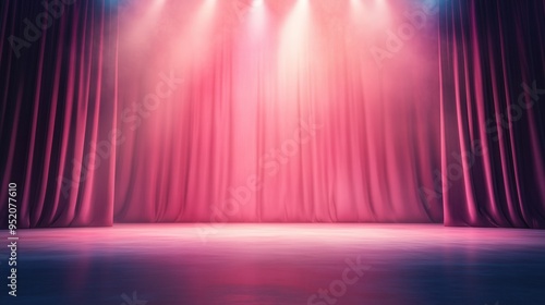 Illuminated stage with pink curtains and soft lighting, perfect for theater productions and performances.