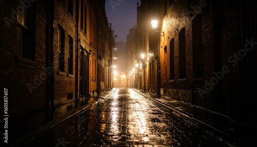 Illuminated urban alleyway with reflective wet pavement offering atmospheric scene
