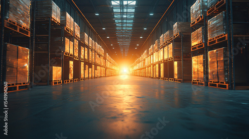 Illuminated Warehouse Aisle with Pallets and Warm Sunset Glow