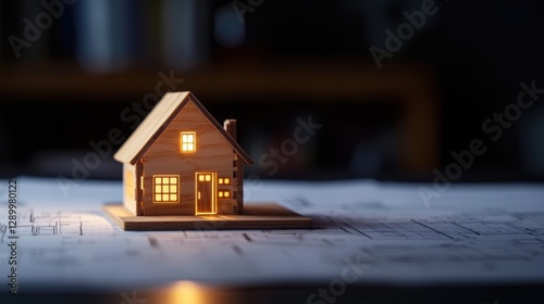 Illuminated wooden house model on architectural blueprints