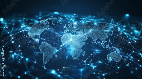 Illuminated world map connected by digital lines, showcasing global communication and technology in a futuristic style.