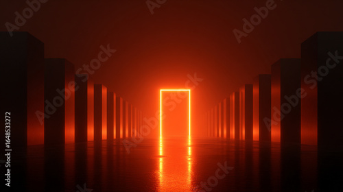 Illuminating Gateway: Neon Portal Amidst Dark Pillars in a Red Hued Environment