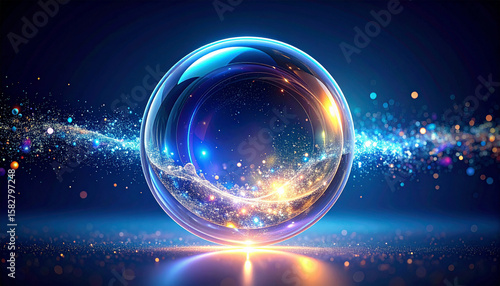Illuminating Orb of the Future: A captivating spherical glass sphere bathed in an ethereal glow, floating against a futuristic backdrop of shimmering light and celestial bodies.