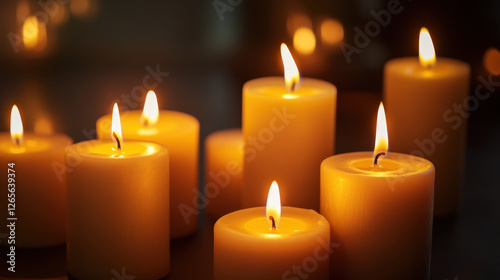 Illuminating serenity: A captivating display of burning candles radiating warmth and tranquility in a dimly lit space promoting relaxation and reflection