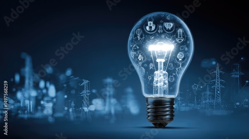 Illuminating Technology: A glowing lightbulb filled with technology icons shines brightly in a blurred cityscape, symbolizing innovation, inspiration, and technological advancement.