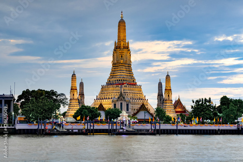 Illumination of Grand Pagoda of Wat Arun Ratchawararam Temple at Sunset, Bangkok, Thailand