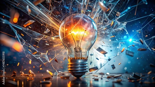 Illumination's Explosive Genesis A Glowing Filament Amidst Shattered Glass and Energetic Sparks
