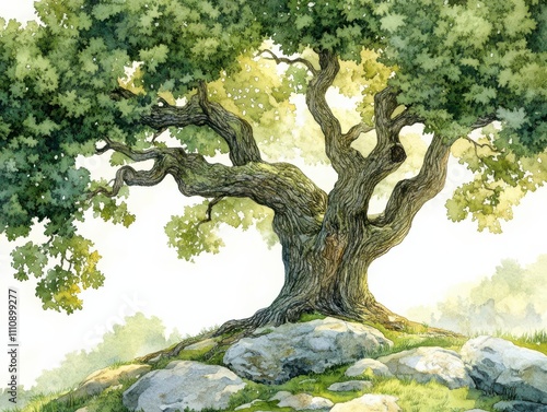 Illustrate a majestic oak tree with intricate leaf patterns, showcasing the cycle of life through natural transpiration using digital watercolor techniques