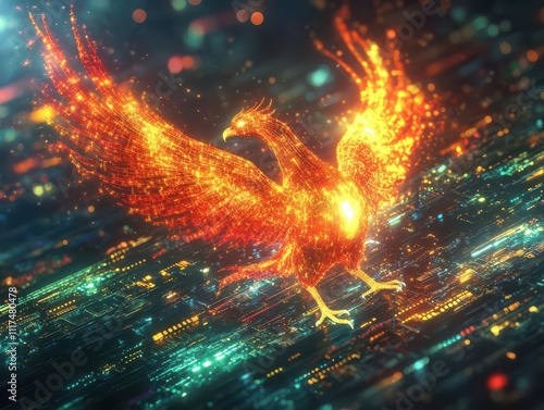 Illustrate a neon-lit, abstract digital phoenix emerging from a sea of data streams, capturing the essence of renewal and spiritual growth with a futuristic twist