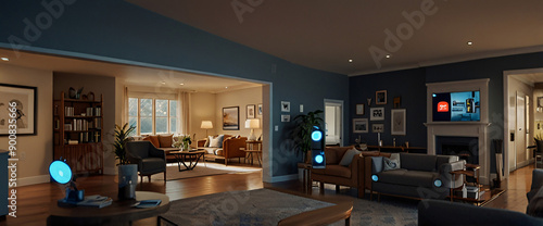 illustrate the concept of the Internet of Things with an image of a smart home, featuring various connected devices and appliances, shot from a low angle with a wide-angle lens