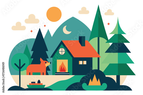Illustrated Cozy Cabin Featuring a Fox, Mountains, Trees, Moon, and a Warm Fireplace