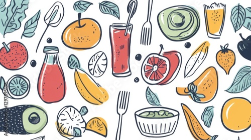 Illustrated Food and Utensils on White Background