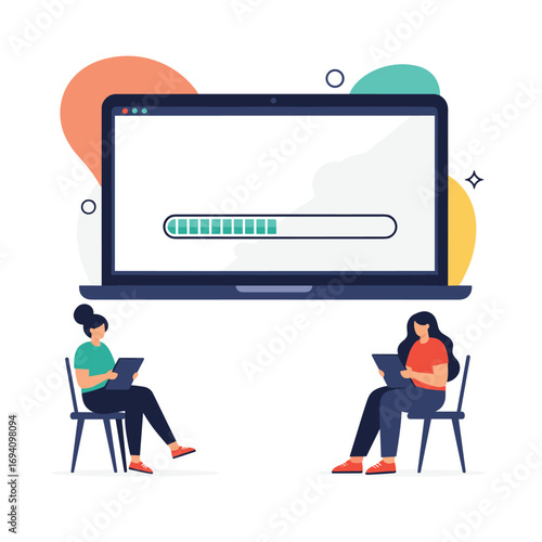 Illustrating the progress of a digital download or installation process on a laptop screen with people watching