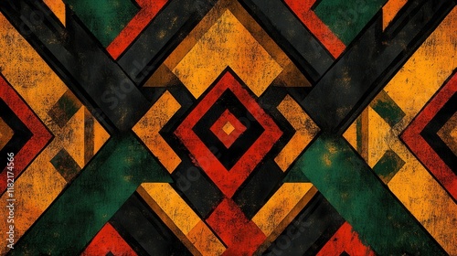 Illustration Abstract geometric pattern with bold red, orange, and green shapes. Black History Month