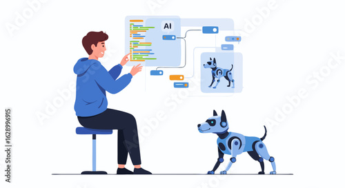 Illustration depicting a programmer designing a robotic dog using artificial intelligence interface showcasing creative tech innovations