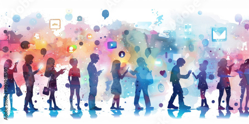 Illustration depicts silhouettes of people looking at smartphones and engaging in social media with colorful watercolor backgrounds and various social media icons floating around them