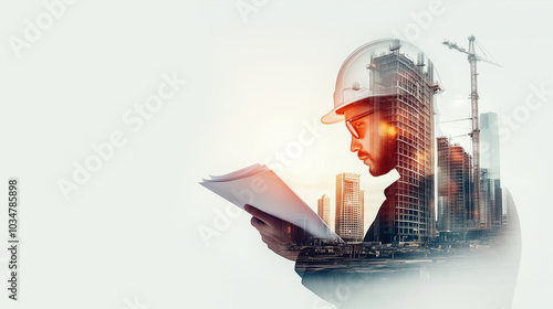 illustration digital building construction engineering with double exposure graphic design. Building engineers, architect people or construction workers working with modern civil equipment technology