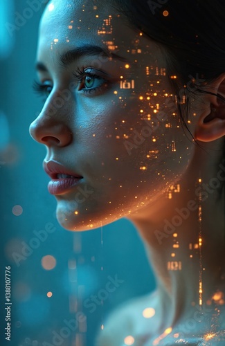 Illustration features woman face with technology overlay. Digital particles on skin, futuristic concept, cyber woman portrait, AI, metaverse. Human-machine integration, innovation in tech. Neural