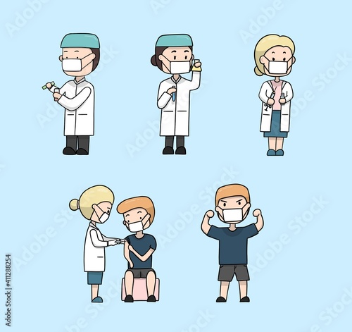 Illustration for people creating vaccine and doctor inject vaccine into a man to protect diseases.