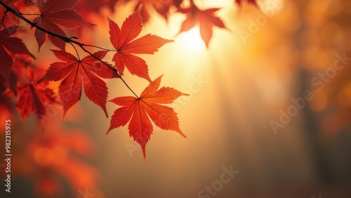 illustration in watercolor style: Red and orange autumn leaves frame a sunny blurred vertical background