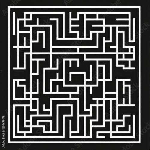 Illustration of 2D style maze all white on black background. White line maze in flat and square style.