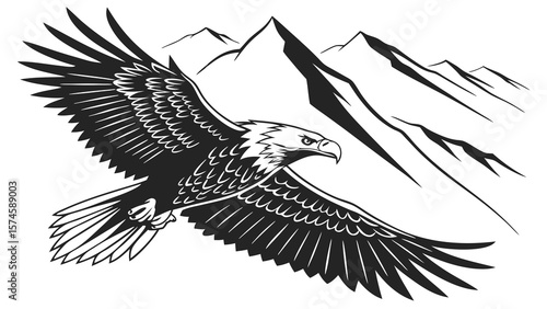 Illustration of a bald eagle soaring in front of a mountain range with detailed feather work and sharp lines