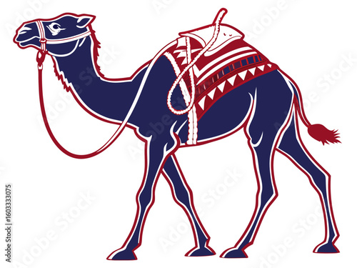 Illustration of a blue and red camel with a saddle and bridle standing on a white background design created with generated ai
