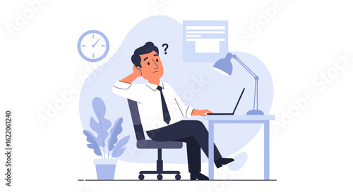 Illustration of a businessman looking thoughtful at his desk, perfect for blog posts about problem-solving or decision-making.