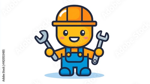 Illustration of a cheerful worker dressed in overalls, grasping a wrench, on a background of dark blue