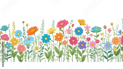 Illustration of a decorative, colorful flower row, designed for accents, on white background.