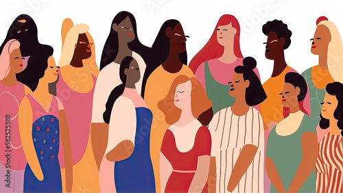 illustration of a diverse group of women on a white background, each with different body types and poses, promoting empowerment. Generative AI